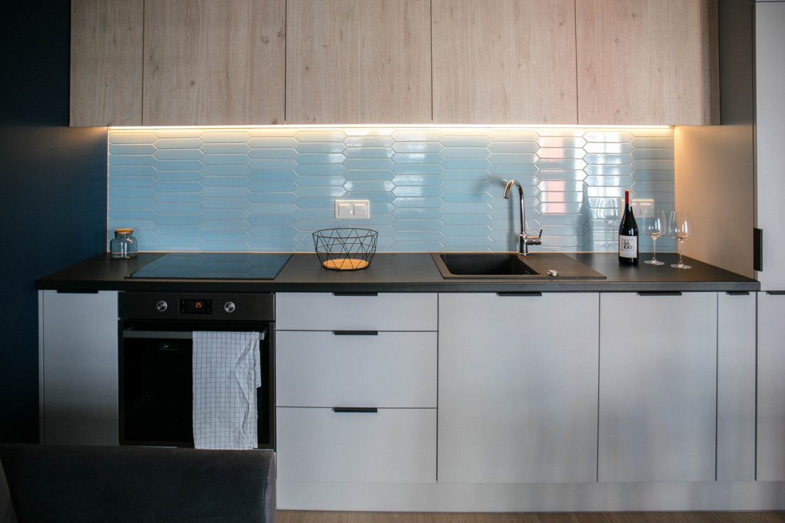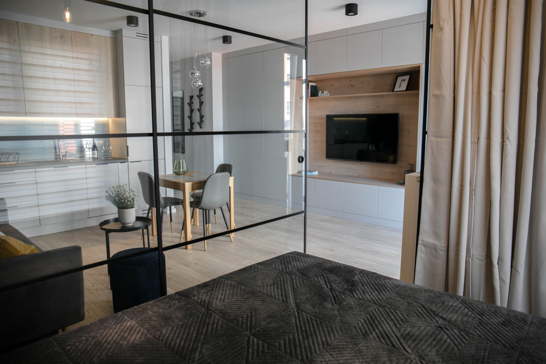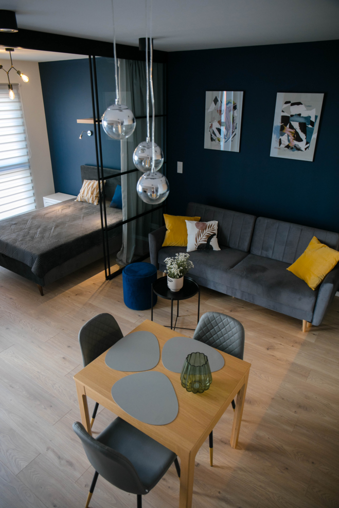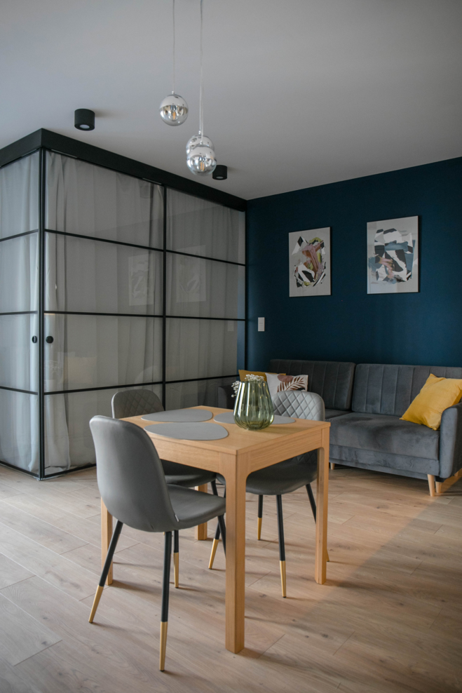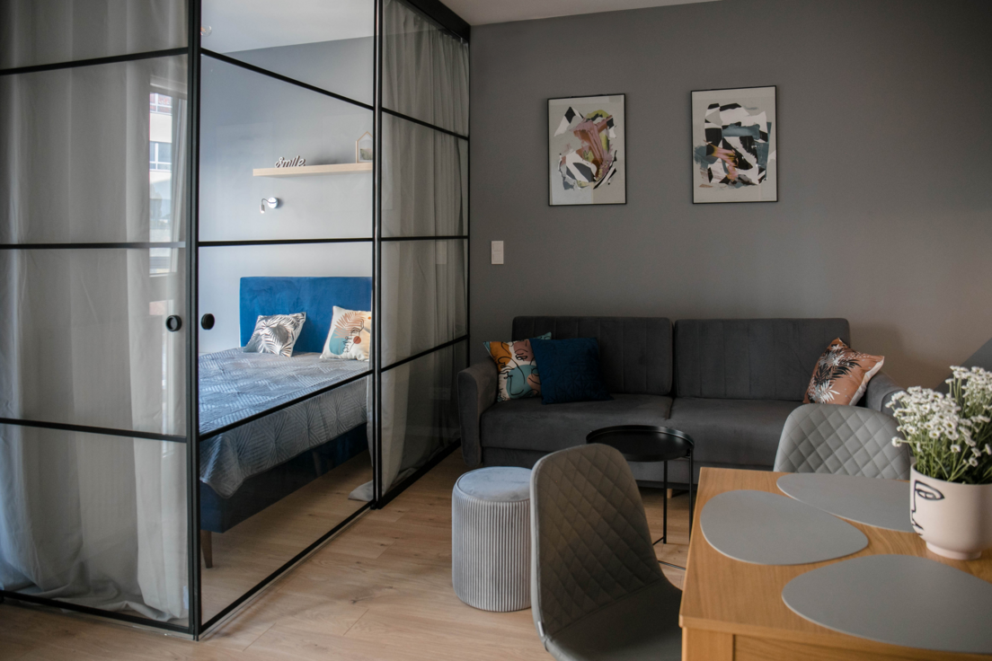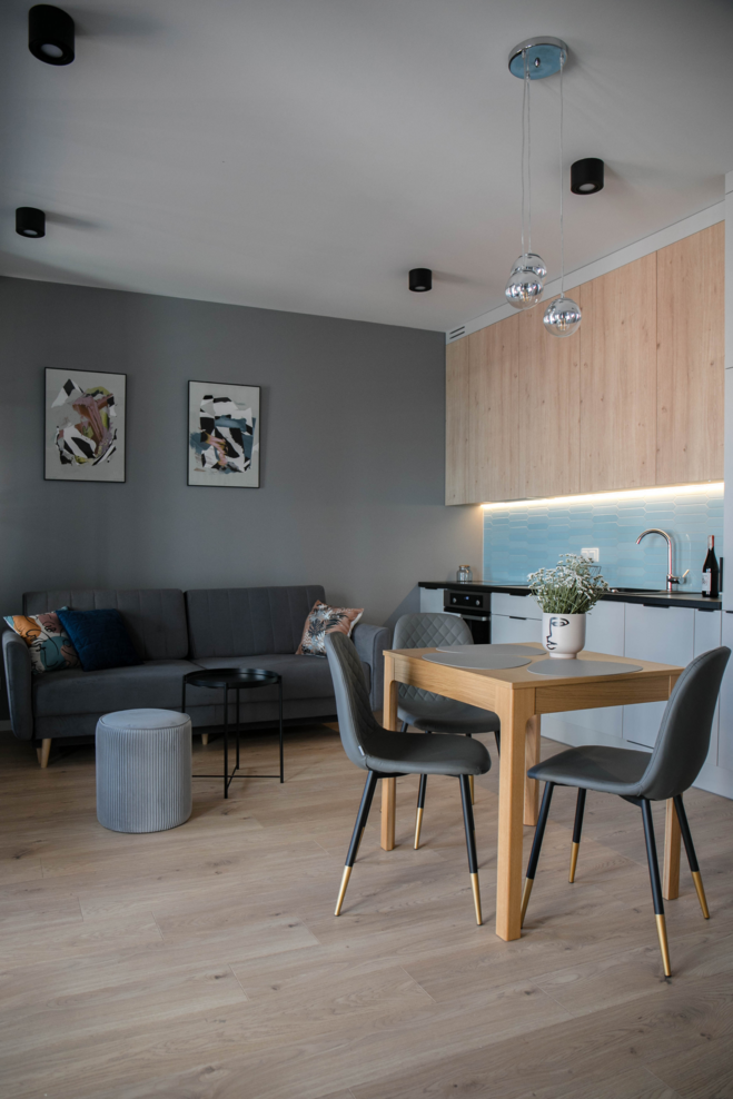 Mieszkania, wykończone w spójnej, neutralnej estetyce, różnią się jedynie akcentami kolorystycznymi, co pozwoliło na optymalizację kosztów. Grafiki Doroty Pawiłowskiej nad sofą wprowadzają unikalny, artystyczny element do wnętrza.