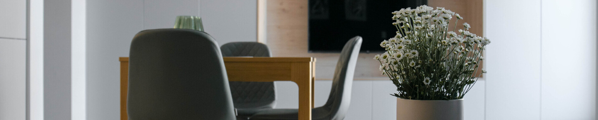 Projekt mieszkania oparty jest na ponadczasowych materiałach, które tworzą elegancką i neutralną przestrzeń. Podstawą kolorystyczną mieszkania są szarości oraz odcienie naturalnego dębu nadając wnętrzu klasyczny, uniwersalny charakter. W łazience i przedpokoju zastosowano płytki w odcieniu białego marmuru, które dodają przestrzeni elegancji i lekkości.