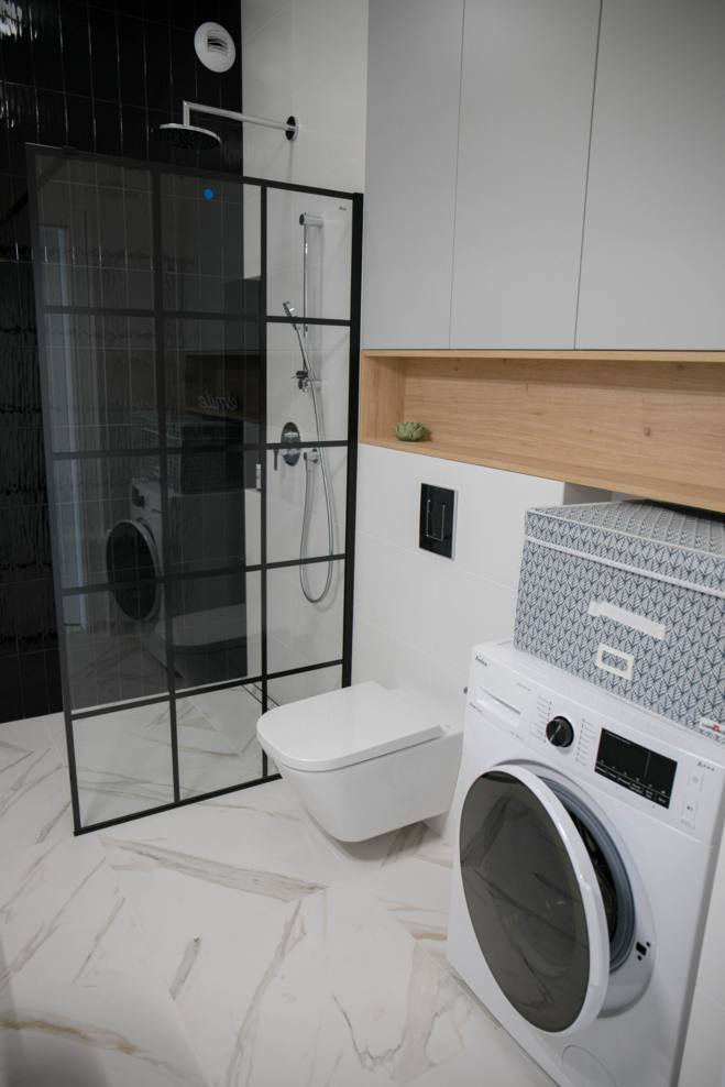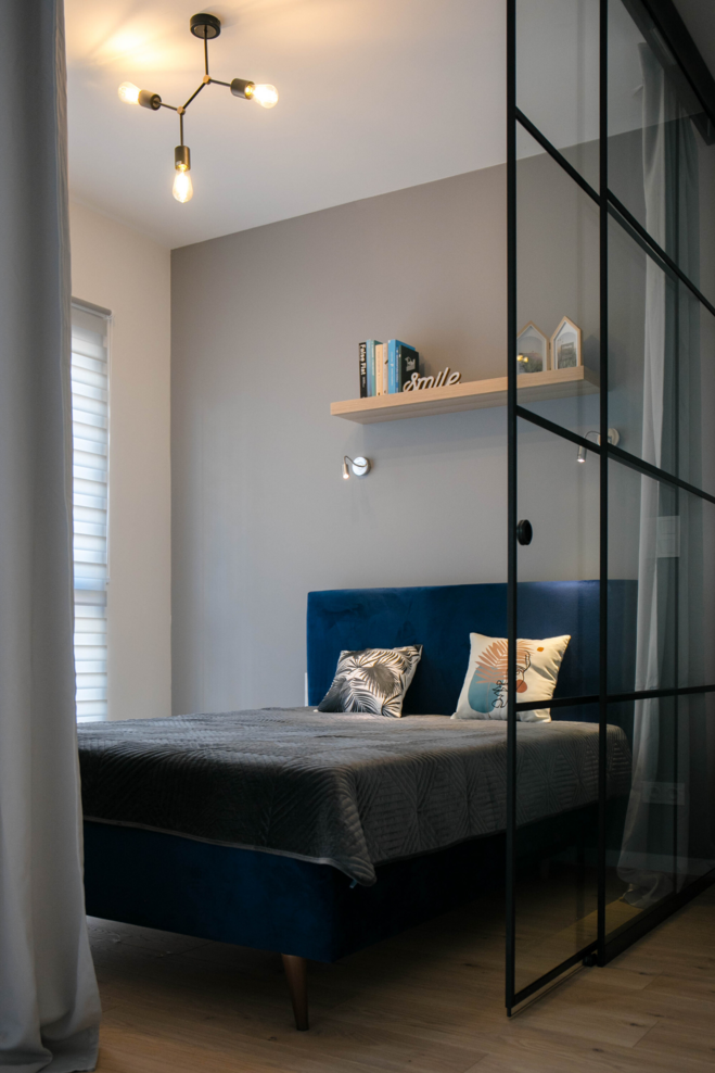 Sypialnia, choć pomniejszona, jest oddzielona szklaną przegrodą, co daje wnętrzu lekkości, a zasłony pozwalają na większą prywatność. W łazience zastosowano prysznic walk-in na całą szerokość łazienki, z funkcjonalnymi półkami na kosmetyki i szybą z czarnymi okuciami nawiązującymi do szklanej zabudowy sypialni.