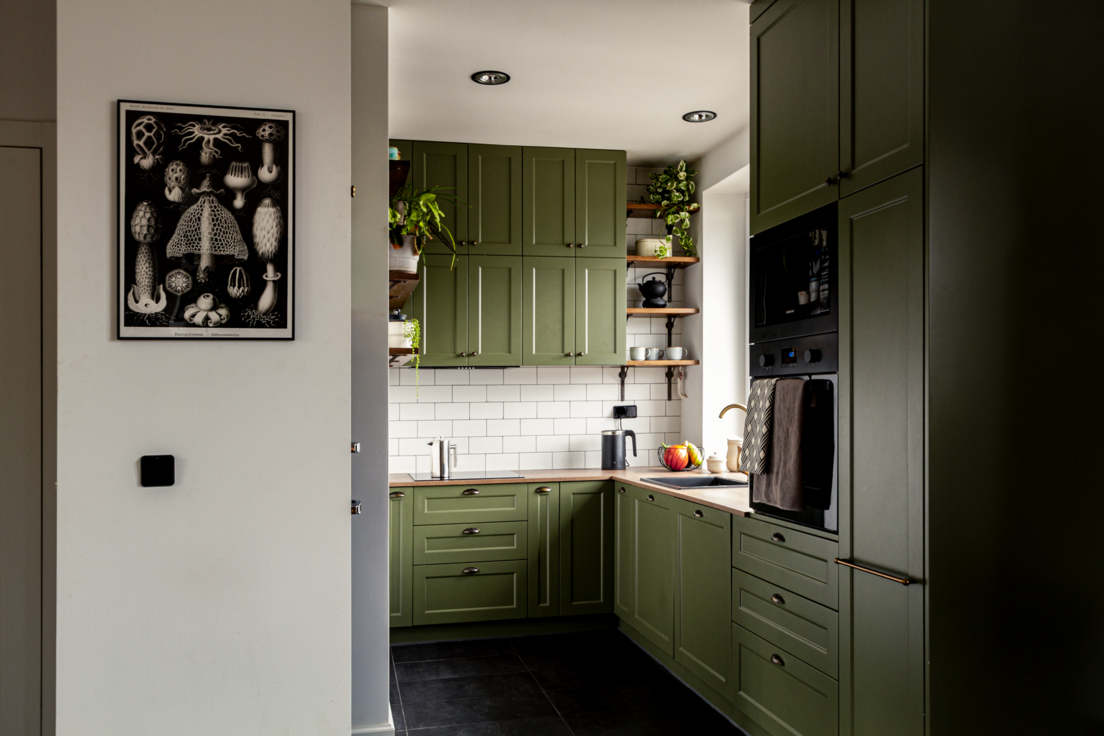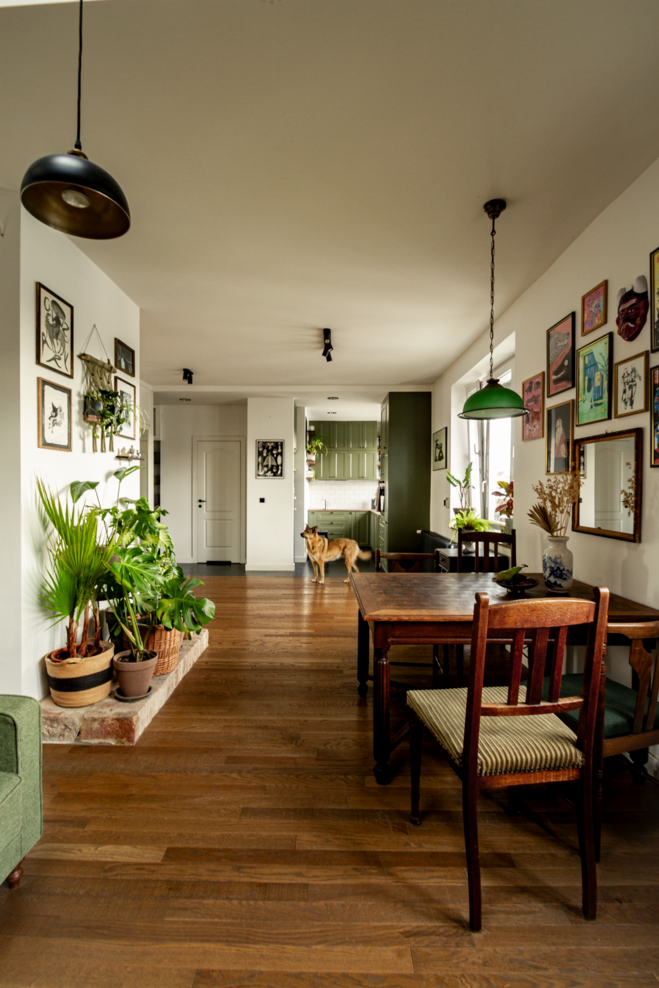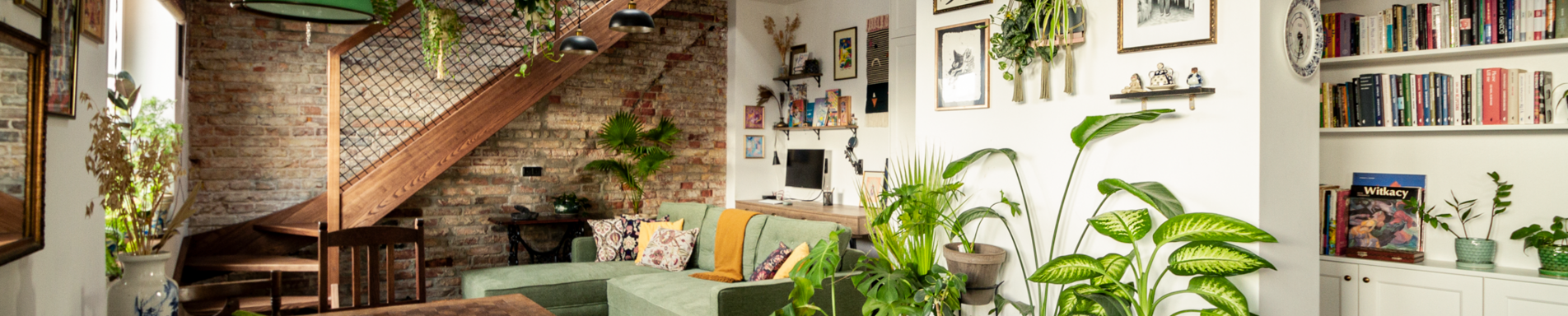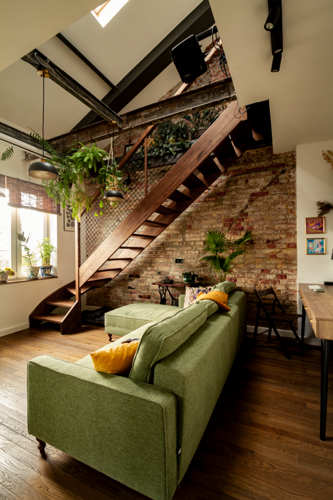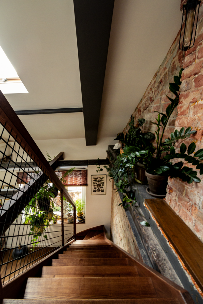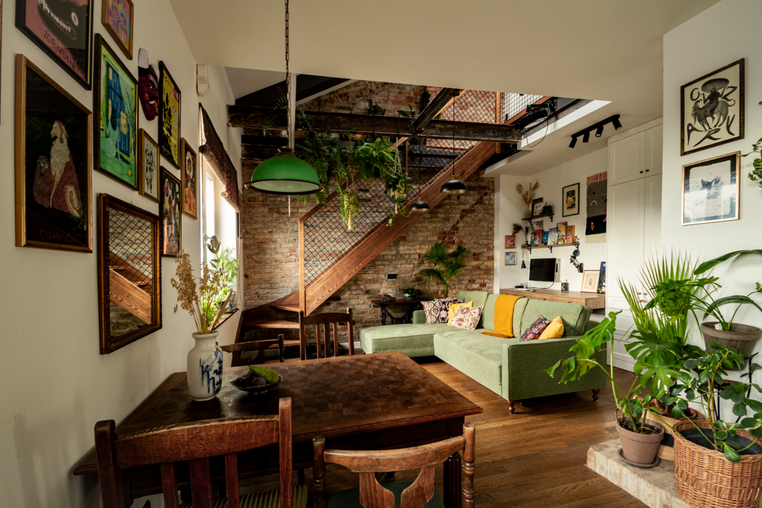W ramach projektu otwarto przestrzeń całego dolnego piętra, tworząc antresolę oraz schody prowadzące na poddasze, gdzie znajdują się pokoje sypialne. Odsłonięto starą ceglaną ścianę, nadając wnętrzu kamienicznego charakteru. Wnętrze zostało wyposażone w starannie dobrane meble i ozdoby, które podkreślają artystyczny charakter mieszkańców. Kolorystyka utrzymana jest w neutralnych odcieniach z akcentami zieleni i złota, nawiązując do krajów pochodzenia właścicieli.